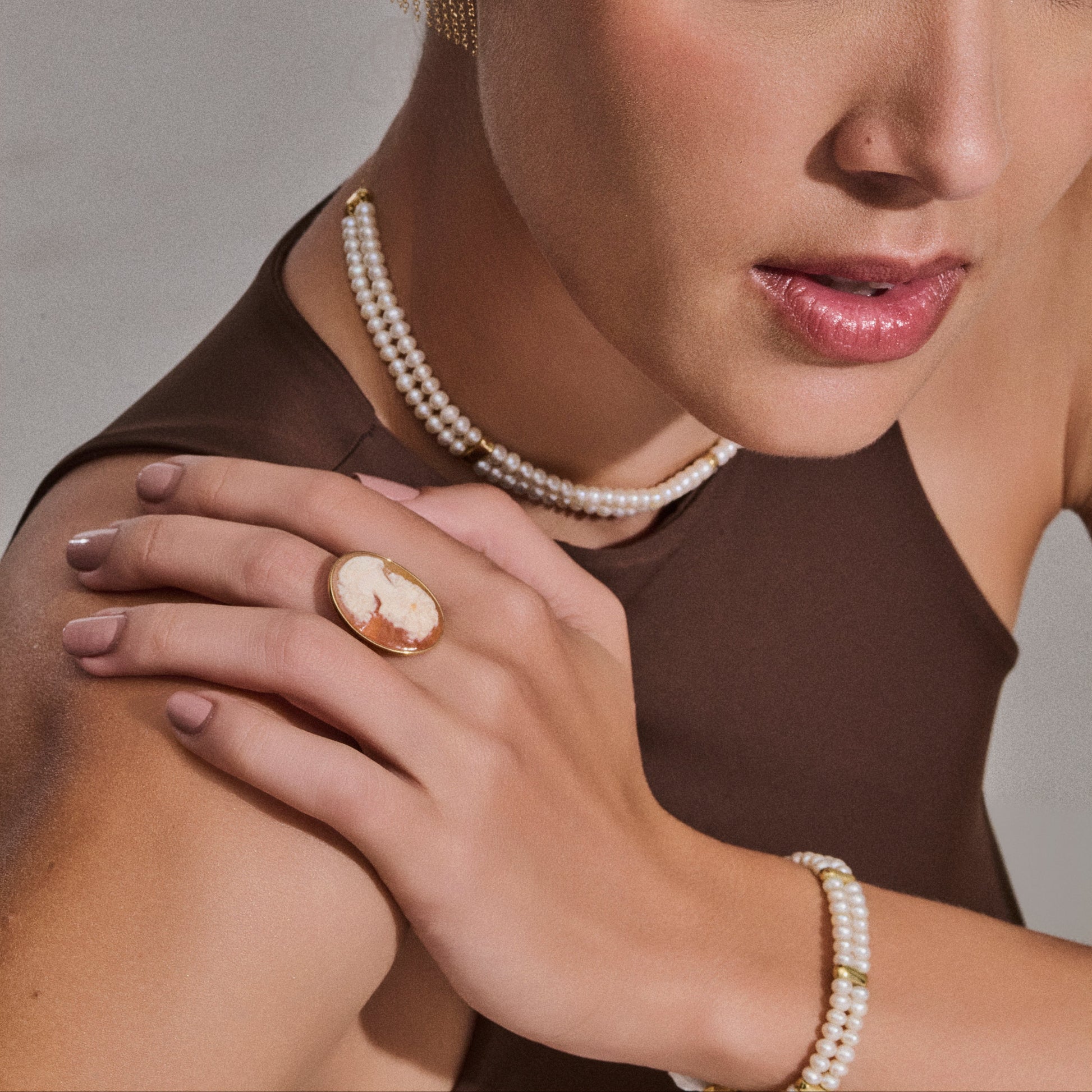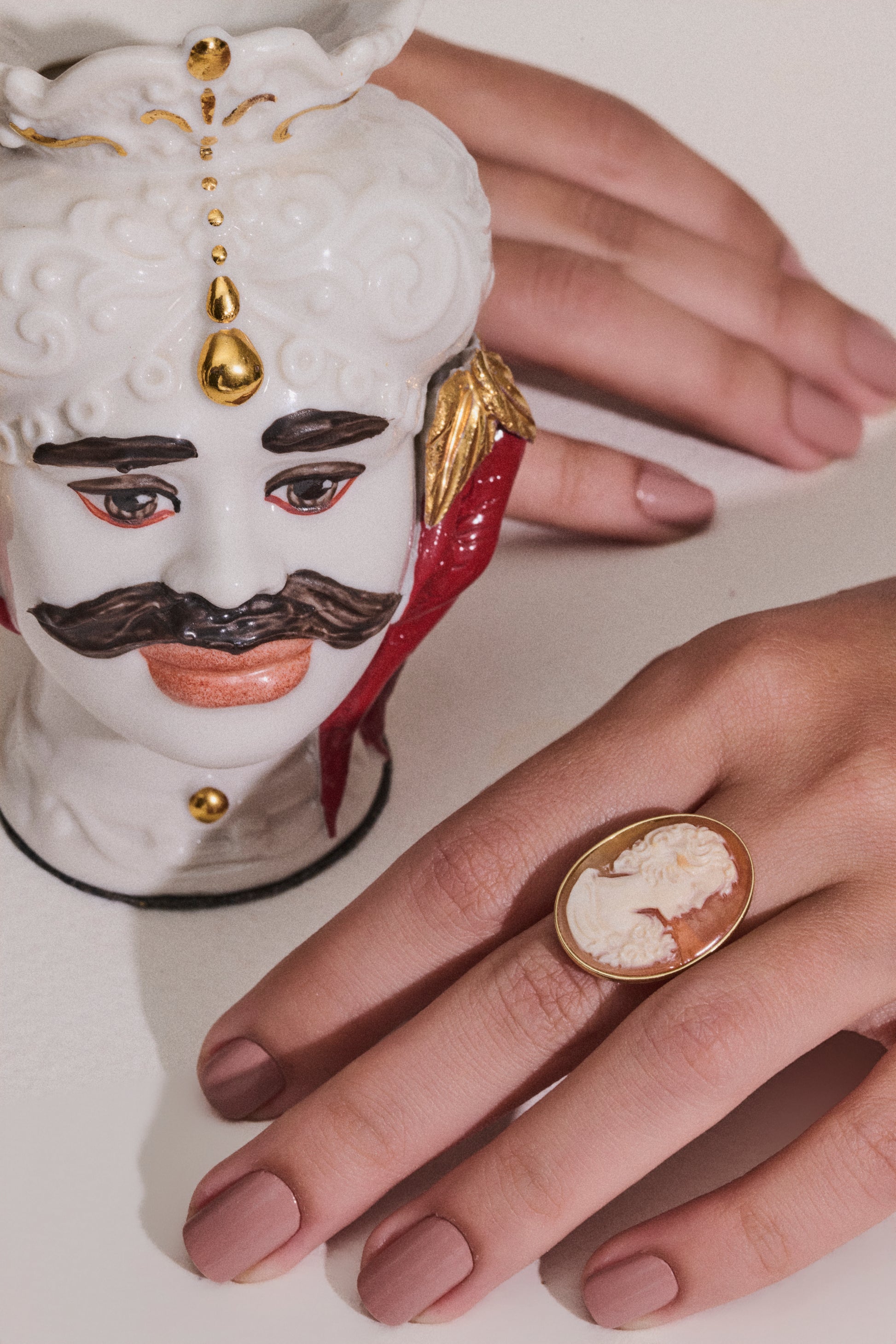 Clássico e cheio de significado, este anel em ouro 18K traz como destaque um camafeu de 25x20 mm delicadamente esculpido em concha madreperola, símbolo de tradição e elegância atemporal.